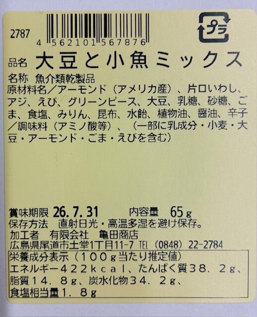 青大豆・昆布・アーモンド・小アジ・エビ・いりこのミックス。