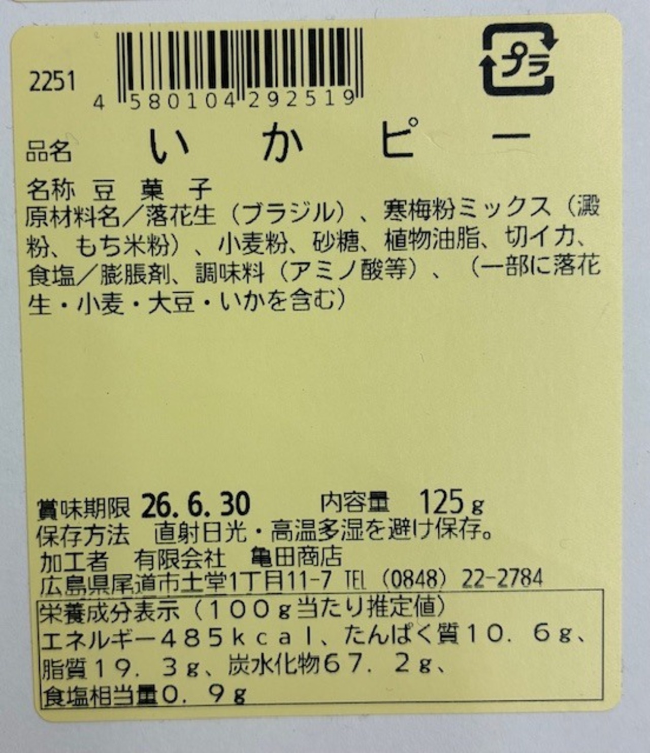 切りイカをたっぷり使ったピーナッツ入り豆菓子。